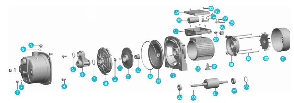 | 2 | Cincin "O". | 14 | Penutup rumah pompa | 26 | Tekan kabel | ||||||