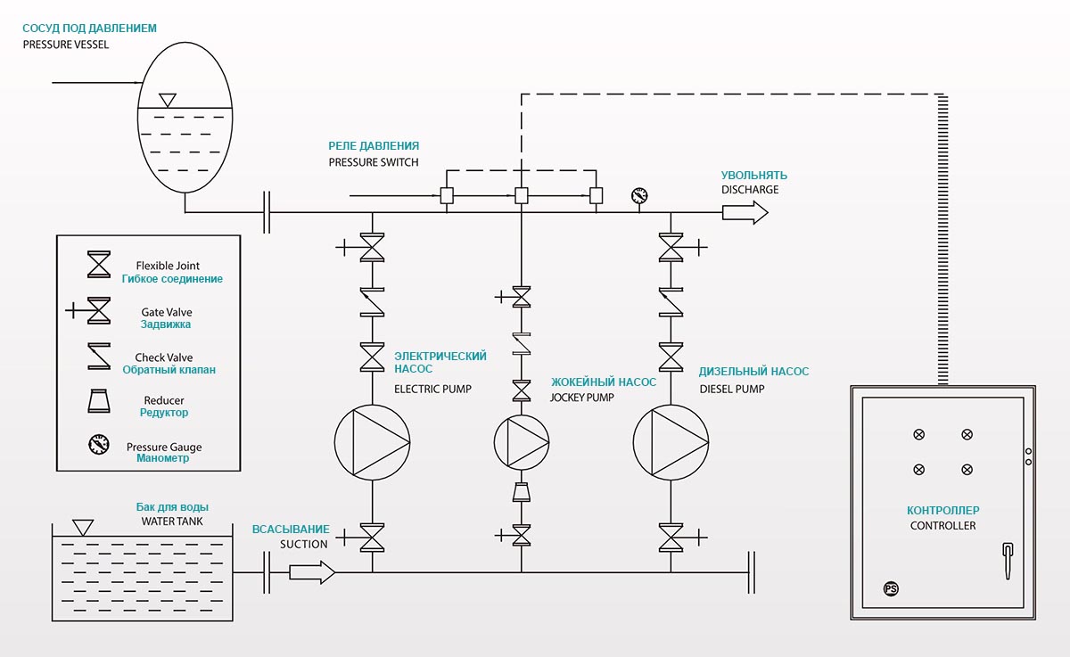 Ketika tekanan turun di bawah nilai yang ditetapkan, joki mulai berlari dengan sinyal dari sakelar tekanan dan terus berlari selama 10 menit hingga tekanan sistem mencapai nilai yang ditetapkan. Jika tekanan terus turun, pompa utama akan mulai bekerja. Jika tekanan sistem tidak dapat disuplai dan tekanan terus turun, pompa siaga akan mulai bekerja.